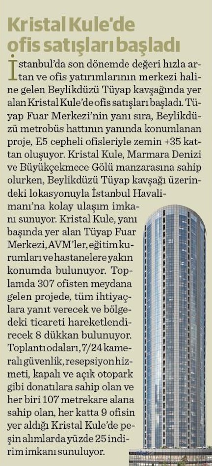 KRİSTAL KULE'DE OFİS SATIŞLARI BAŞLADI
